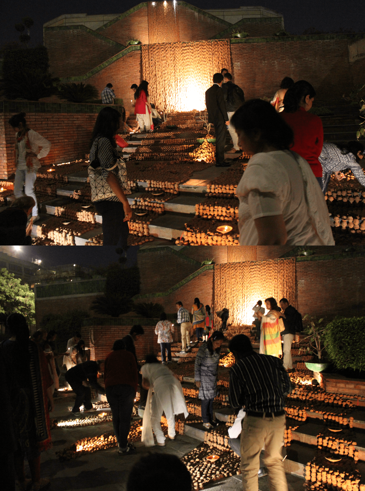 It was freezing cold of early January in Delhi with temperatures running really low. The entire Plaza steps had been washed and cleaned before the diyas could be laid out. And I along with a small motley group of workers were laying out the diyas on the extremely cold floor diya by diya, we had lakhs of them to be laid out for the river to take shape as I had visualized. Every single diya had to be manually inverted and placed in basic formation as the river tributaries I had imagined. Each diya had to be joined with the previous one without any glue or tape or any fixative.