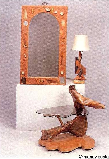 Born in 1967, Gupta is a self-taught artist His solo shows at the Birla Academy of Art and Culture at Calcutta in l996andattheTajBengalin Calcutta in 1997were highly acclaimed. The Calcutta painter who has now moved to Delhi confesses to a deep-rooted attachment towards nature. The furniture he sculpts “are recycled roots”, reminding one of swans, octopuses and antelopes. The exotic blend of flora and fauna ai-e drawn from his early years at the National Library campus.
