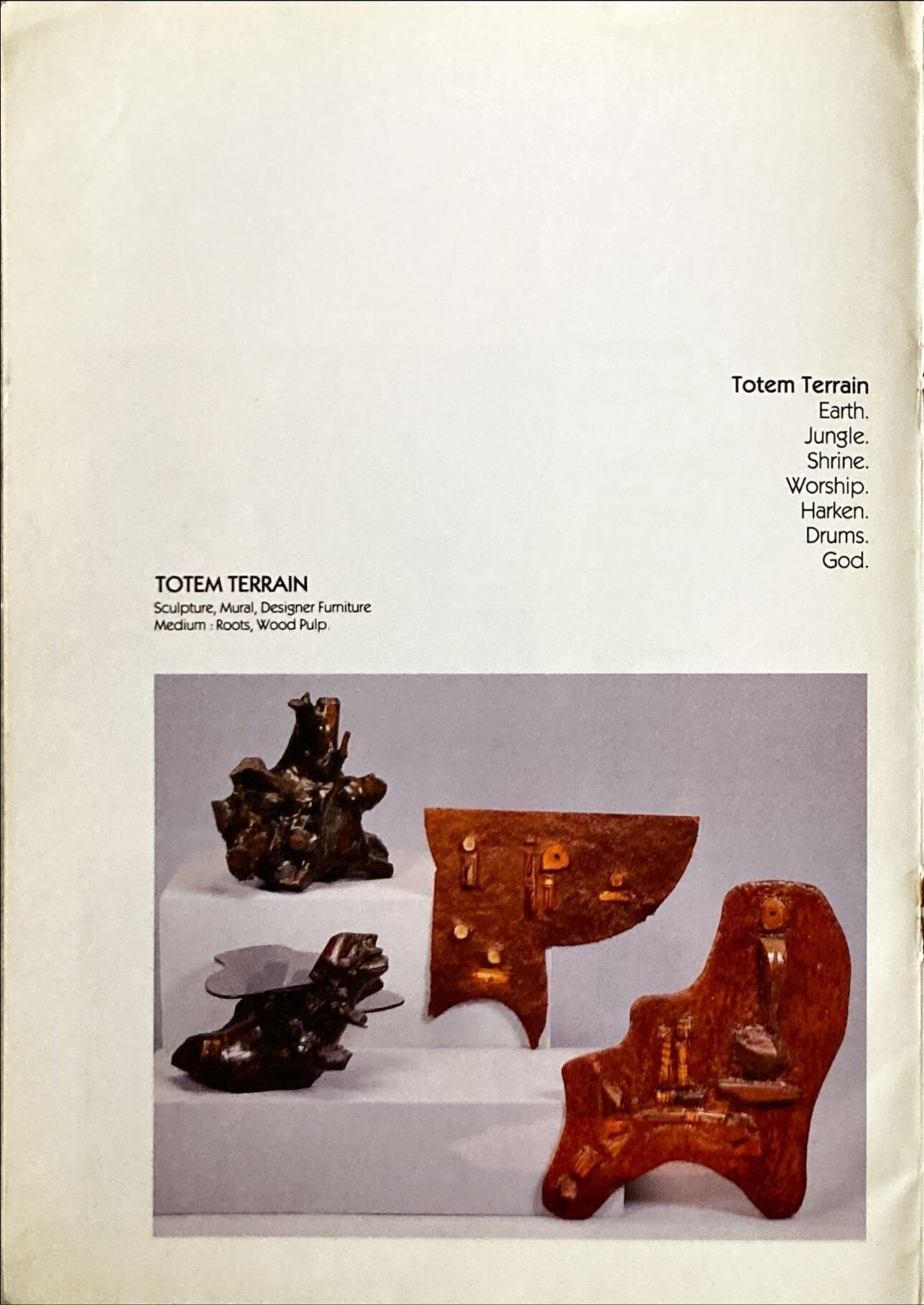 The murals and small wall decorative pieces have been constructed as to give an effect of totems, jungle gods and drums, conveying a catchy aura of primitivism. A limited, though personal contribution to the art of living.