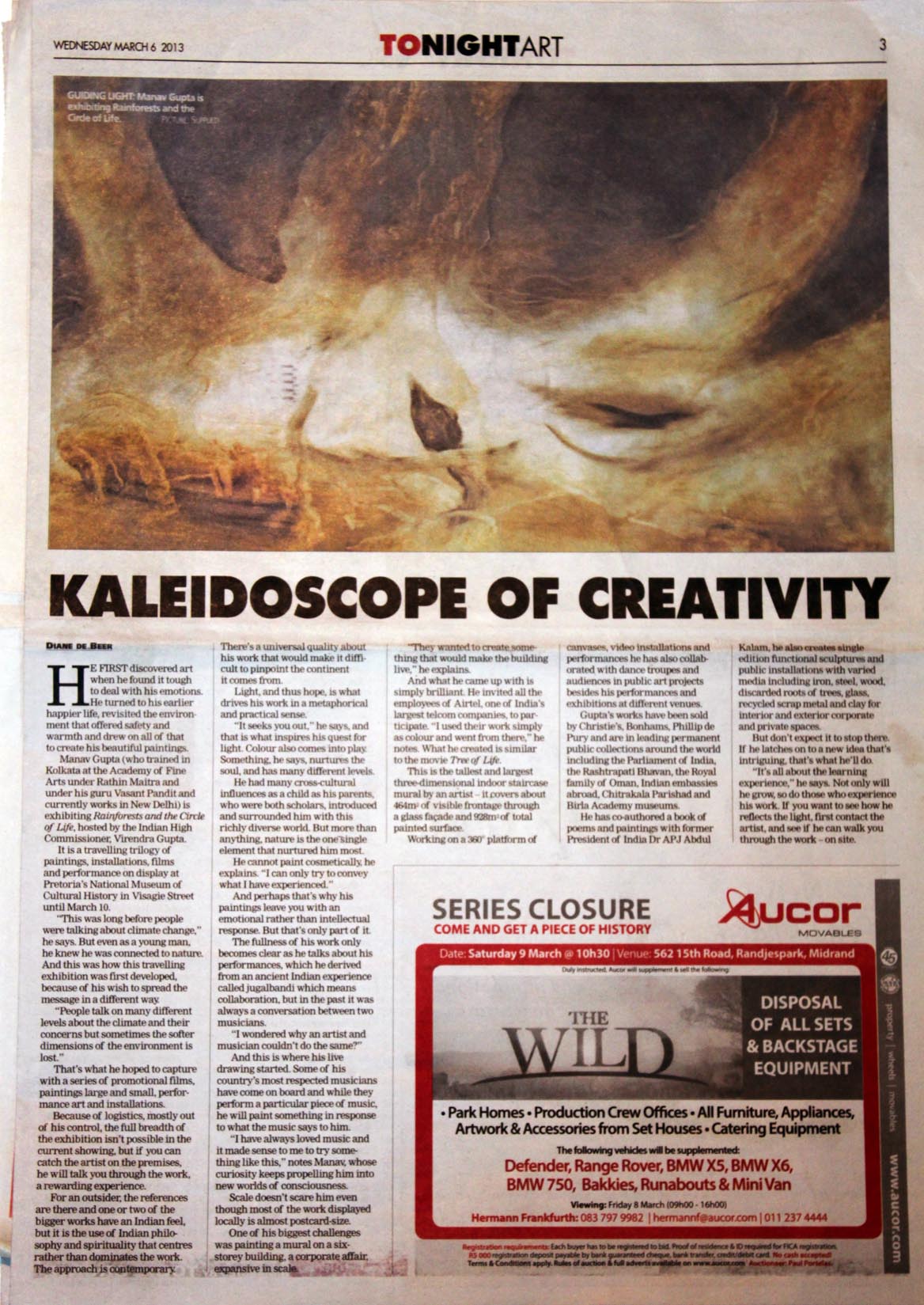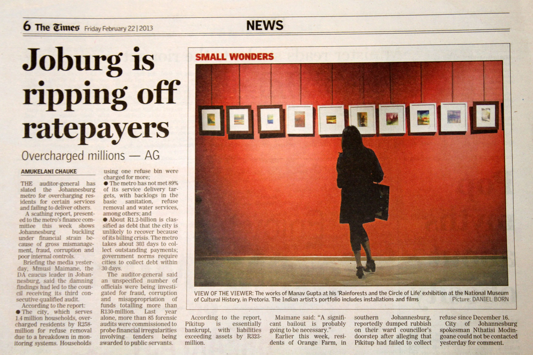 GUPTA’S GREEN TRILOGY : At a time when many artists turn to the west in desperate need for a brainwave, Gupta has universalised the diya – an inevitable fraction of Indian Culture – to draw attention to a contemporary issue.The installation is a metaphor where the earthen lamps signify earth.” Adila Matra, MAIL TODAY (i) | KALEIDOSCOPE OF CREATIVITY It is the use of Indian philosophy and spirituality that centers rather than dominates the work. The approach is contemporary. Light, and thus hope, is what drives his work in a metaphorical and practical sense. Diane de Beer, ARTS EDITOR, PRETORIA NEWS (i) | | GUPTA’S RAINFOREST’S ART A HIT Artist Manav Gupta is a visionary who uses his works of art to get his message across that the dire state of the earth is in the hands of mankind. Doreen Premdev, SUNDAY TIMES, (i) SOUTH AFRICA | Calibre enough to juxtapose it with Marcel Duchamp’s Fountain This latest installation reflects the brilliant conceptualisation of the artist in his inverting the everyday humble utilitarian earthen lamp to encrypt it into the river of clay resulting in many considering it to be of calibre enough to juxtapose it with Marcel Duchamp’s Fountain. Whats on!, Johannesburg (i) |