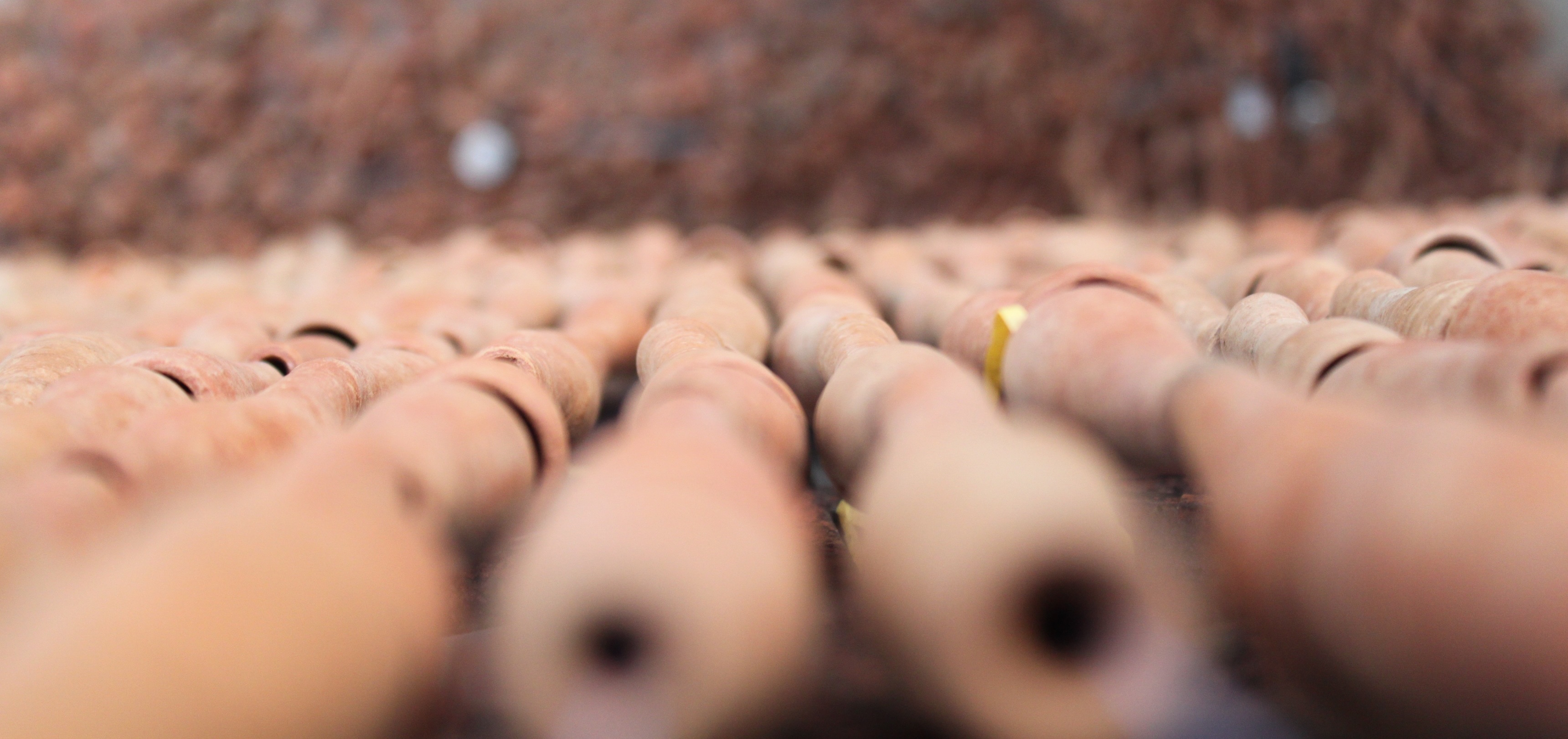 Rain, his work comprising chilum -the traditional smoking pipe of clay associated with intoxication – strung meticulously into thin wires, succeeds in creating a poetic depiction of rain. The viewer can feel the flow of drops. The pitter-patter is tapped in a drenching fall in the remarkable use of one element to depict another. Clay for water. Diyas arranged most cleverly on wires define the sense of play in his own understanding of rain and its geometry. “Each strand is important. Each string is important,” he adds.