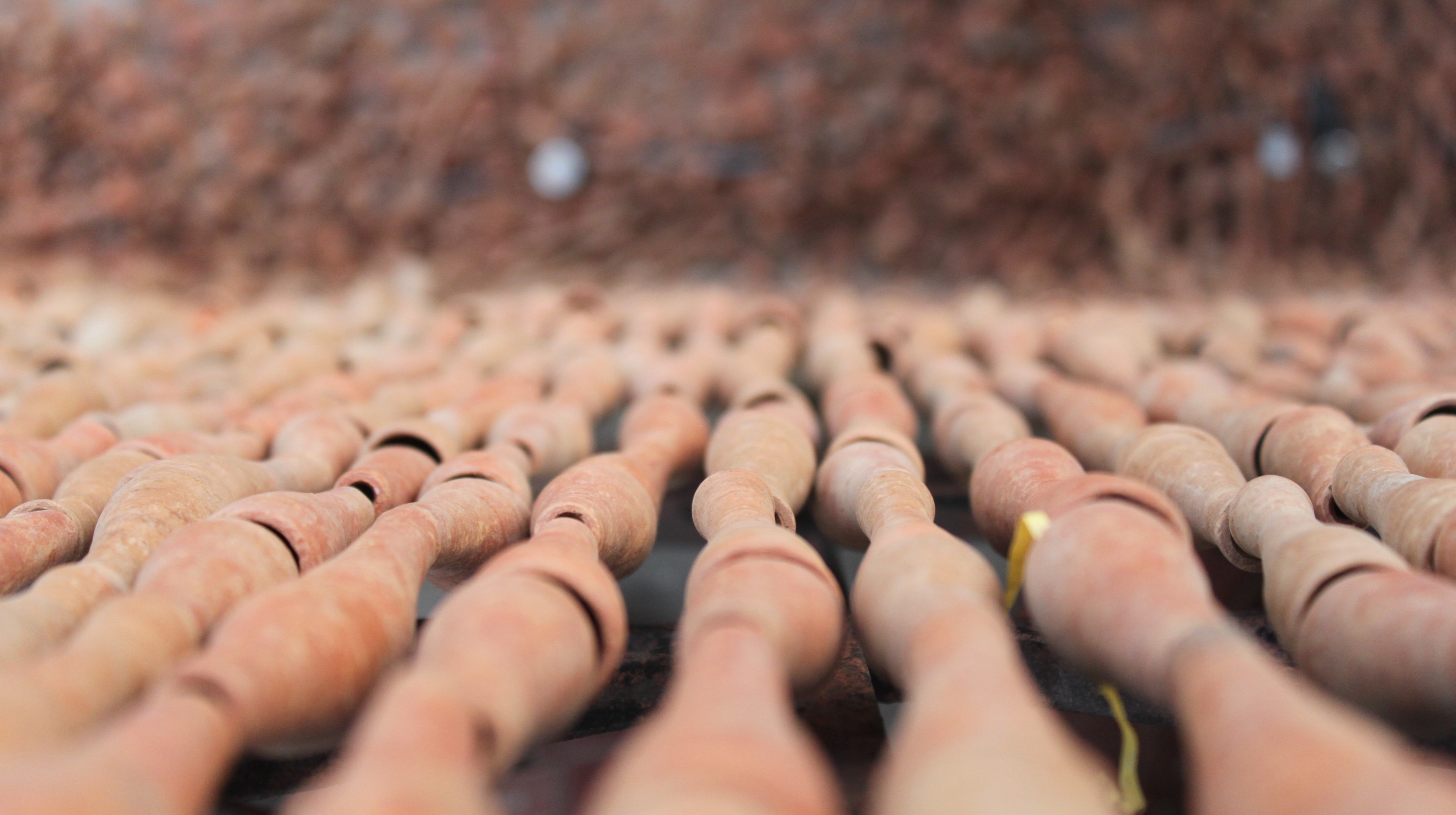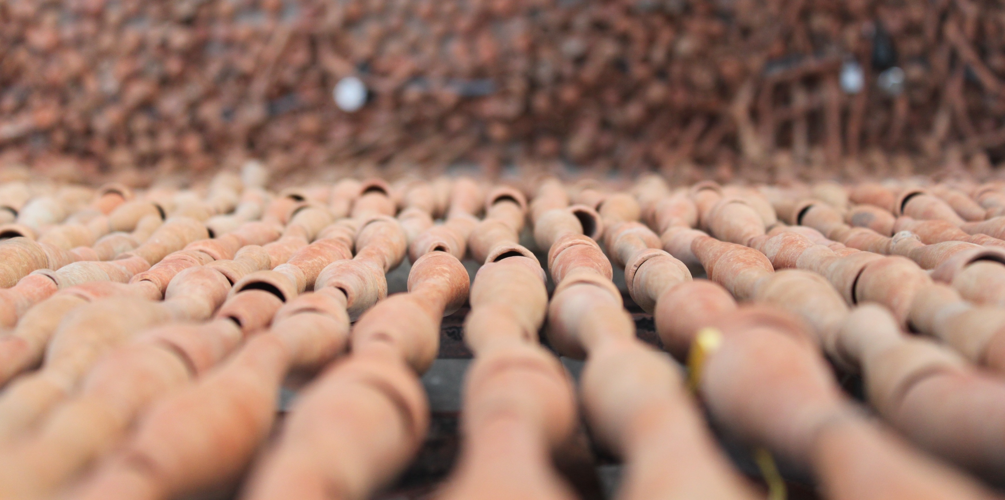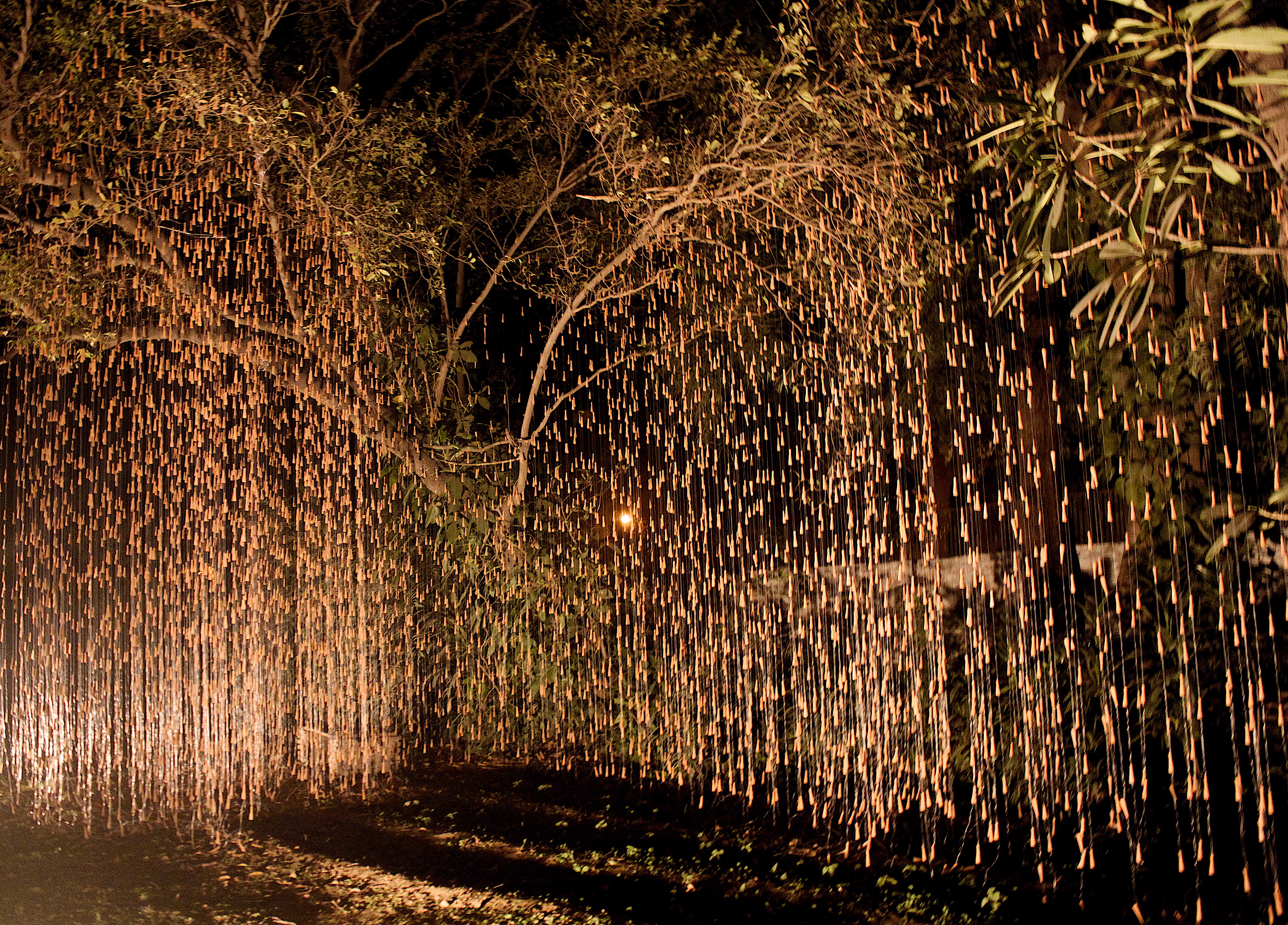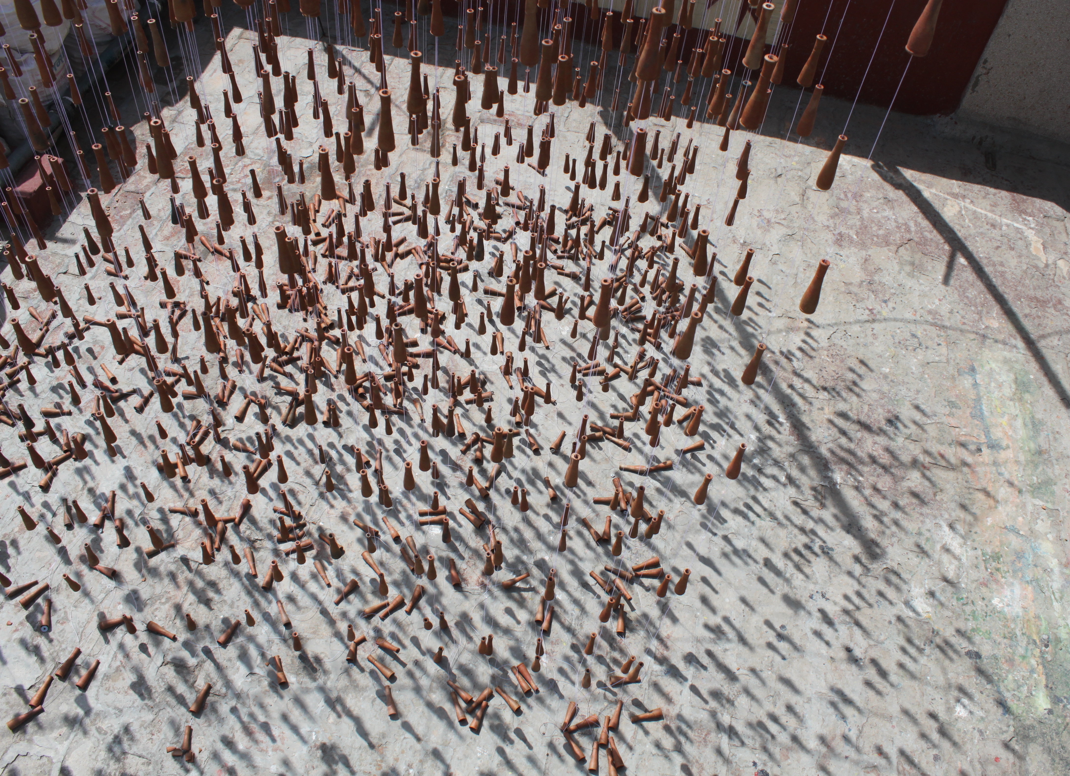 He catches the flow in broken geometry. He arrives, very close in his work, at the inner texture of the falling rain. It is understood and experienced best when one walks through the strings of clay chilum falling from tree branches. It is while standing between the falling wires studded with the chilum when Gupta’s fine handling of the most simple activity in nature and season, that of rain, arises distinctly. The effect is similar to what a viewer would experience when he sees an object kept between parallel mirrors. This, in particular, is more intoxicating than any intoxication associated with the chilum itself. “I tell my viewers – get drenched in the rain of chilum,” he says.