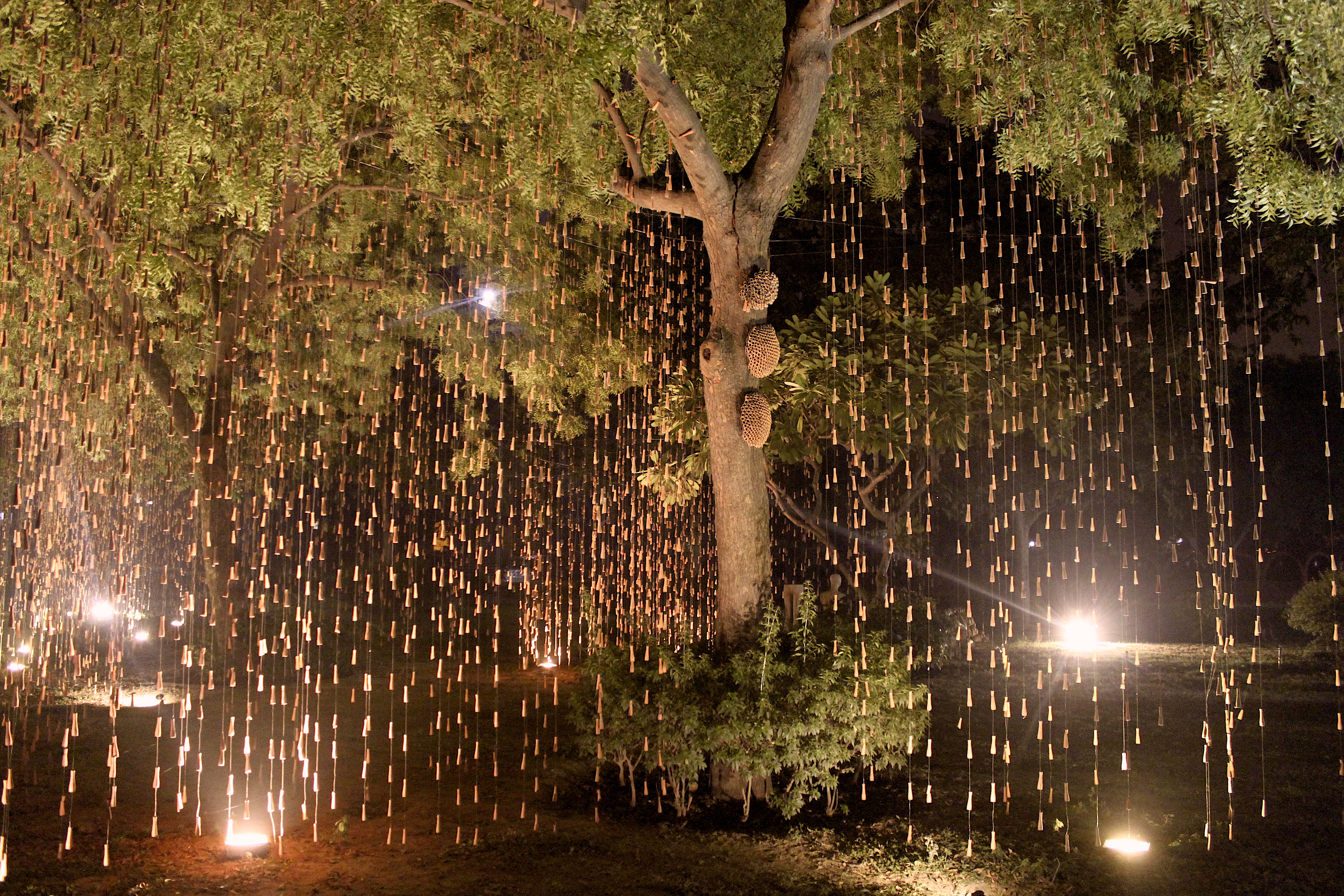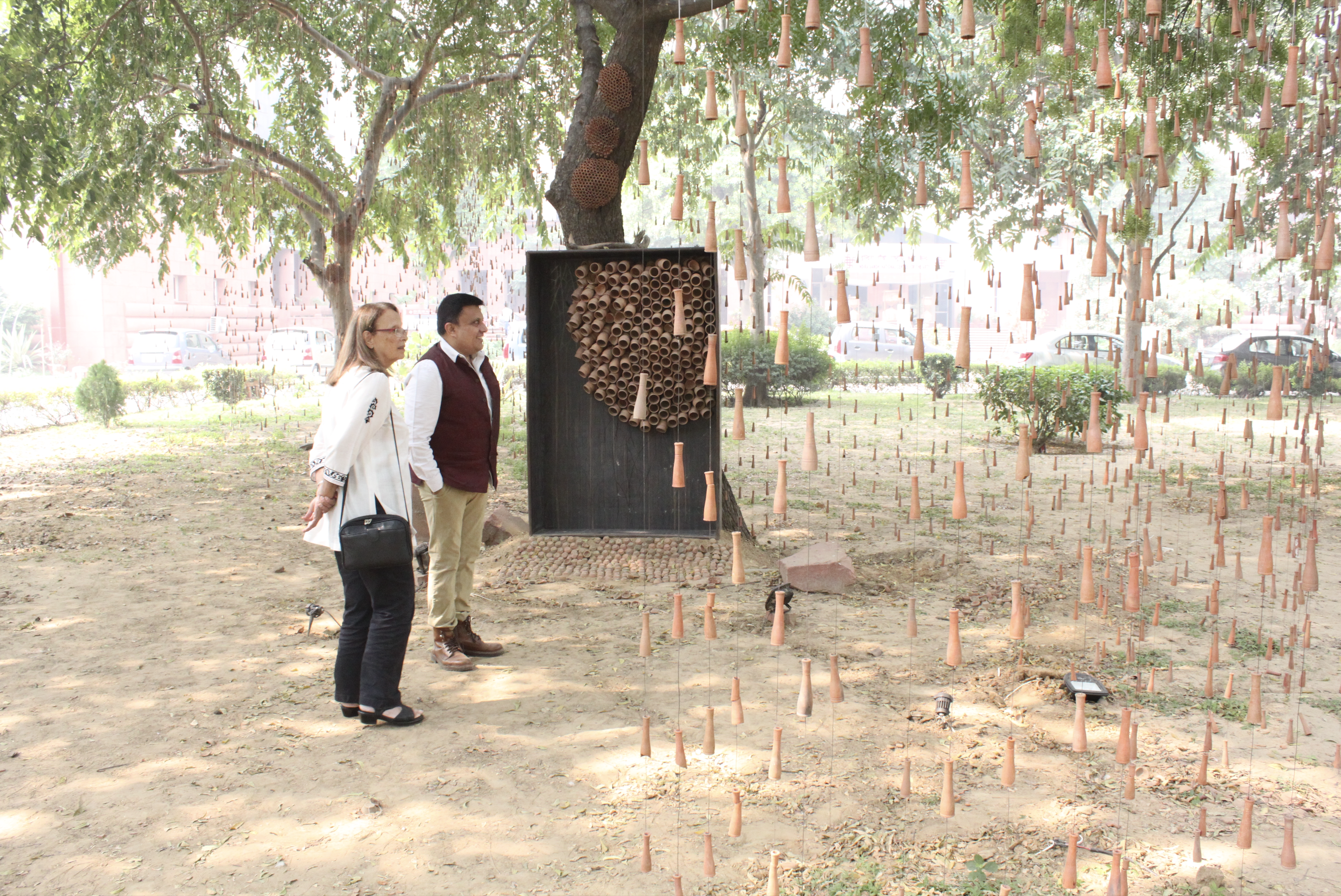 It is remarkable how Gupta’s artwork continues to evolve and transform over months as the installation remains exposed to the elements in outdoor settings. He considers trees as his laboratory, having previously utilized fallen trees as sculptural elements. In the current display, the symbolism of rain falling from tree branches holds significance. The interplay between rain and trees further deepens the conceptual layers of Gupta’s artwork. Human presence is pleasant disturbance. Parakeets fly in and out of the Beehive Garden project – one of the most fulfilling works. Parakeets leave feathers behind as temporary mementos on clay on the beehives. The cuckoo continues the dialogue with trees. Other birds visiting the trees discuss their daily lives, swinging on the raindrops of clay in ‘Rain’, once in a while. Crows grumble nesting issues.