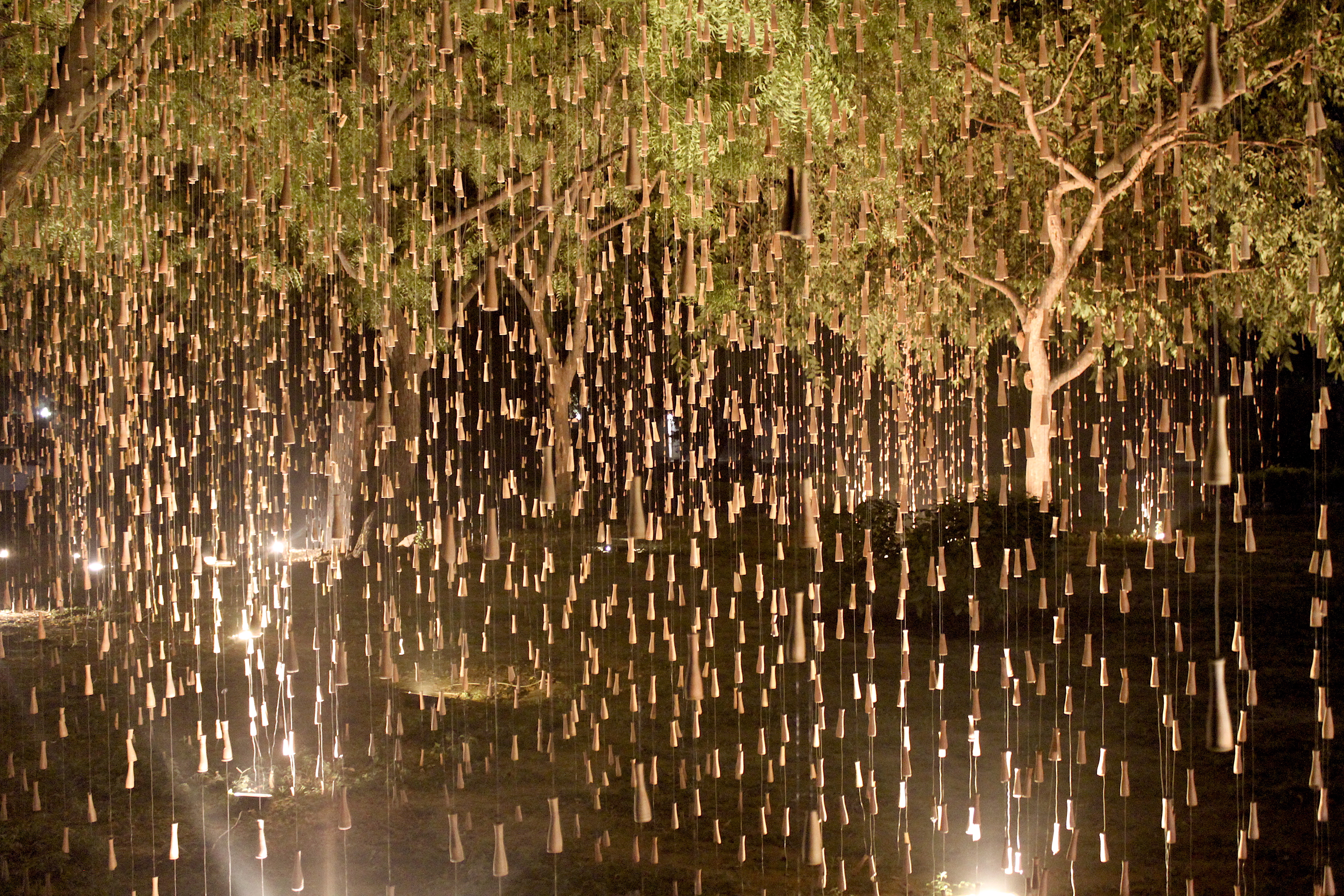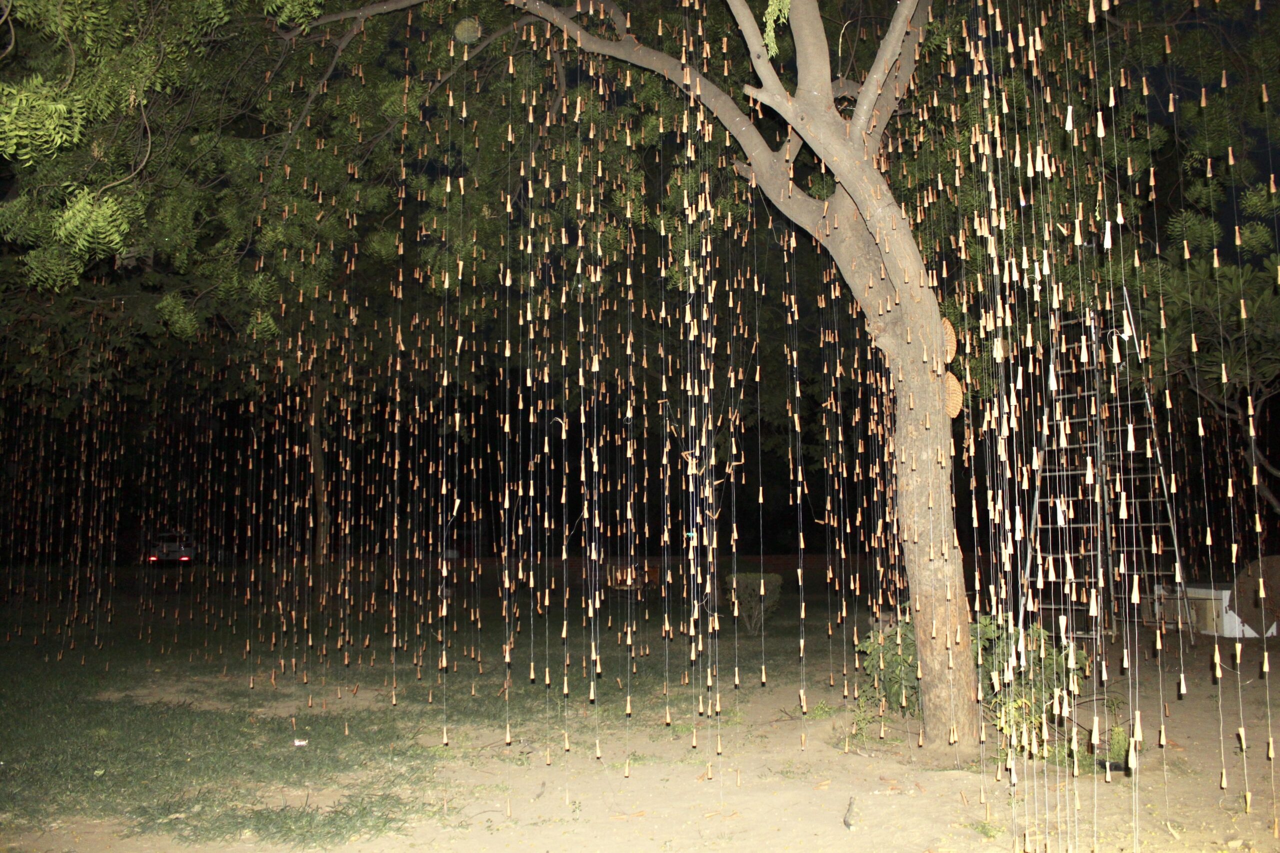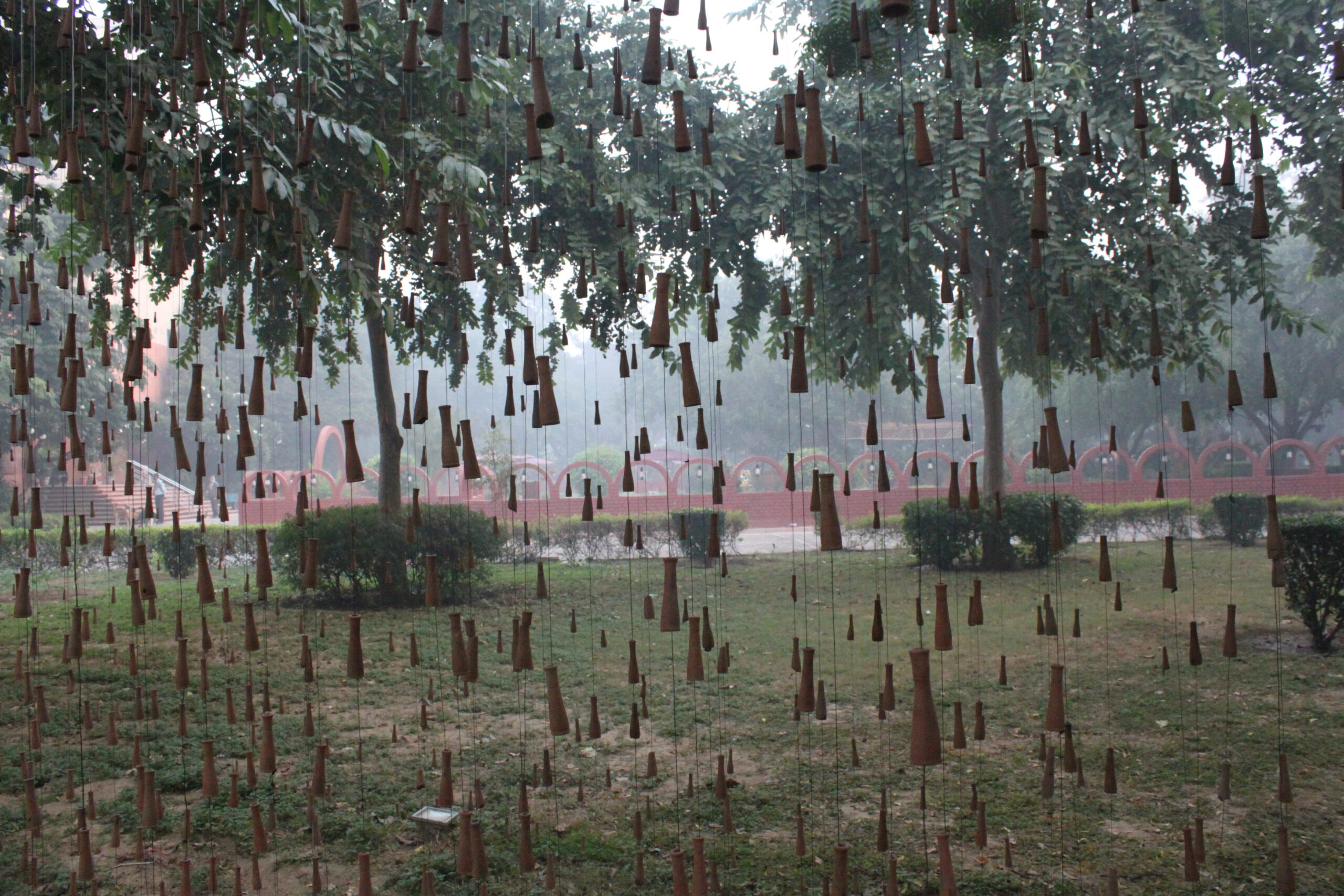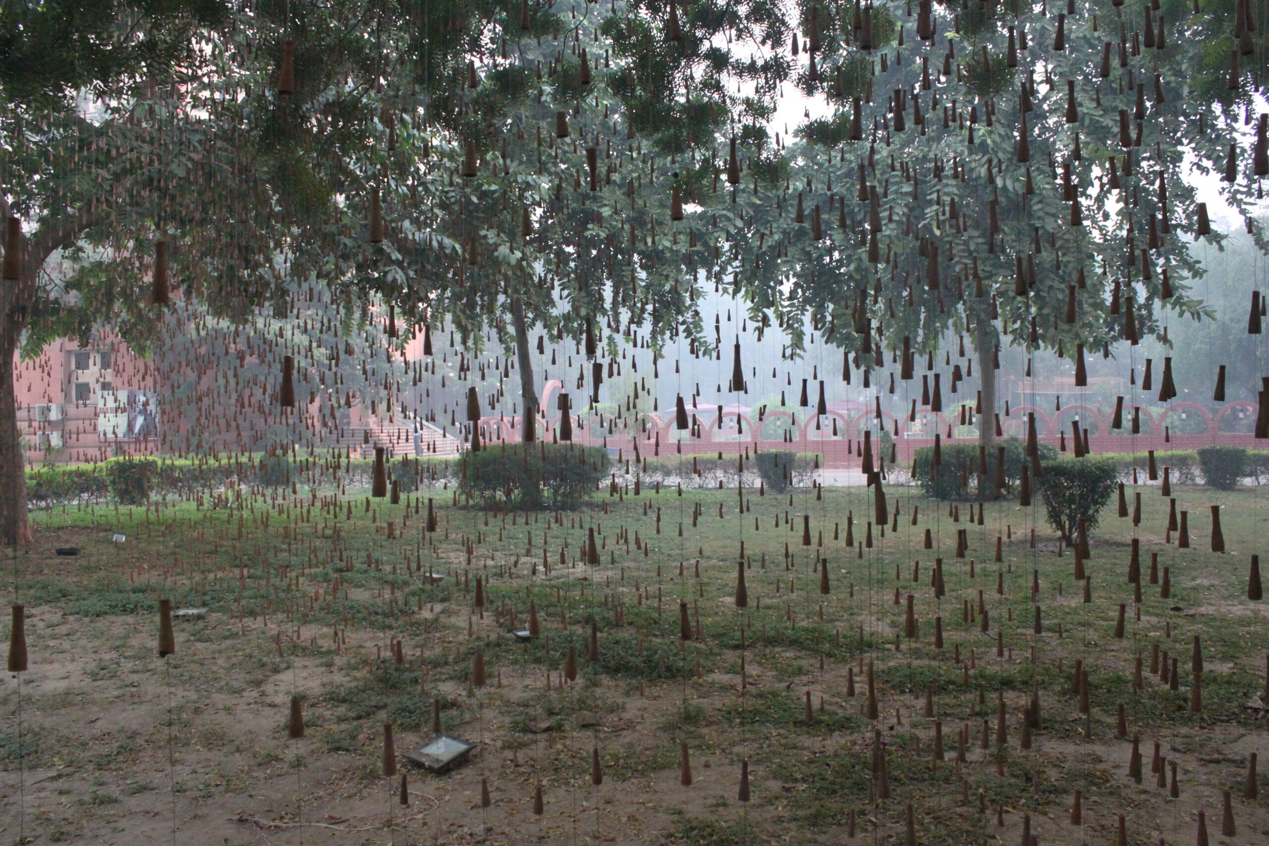 Quoting Art Critic Sumati Maheswari ‘The true essence of Gupta’s creation lies in the wonder and awe that it evokes, of art imitating nature. Right from the first glance that the viewer has – as a first panoramic perspective encounter, the moment he/she has rain in sight, right up to the point when one stands amidst the falling rain hanging from tree branches. This immersive encounter allows viewers to appreciate Gupta’s skilful portrayal of the simple yet profound phenomenon of rain. The effect created by Gupta’s installation is akin to the visual experience of an object placed between parallel mirrors, evoking a sense of fascination and immersion. Interestingly, this sensation surpasses the intoxication typically associated with the chillum itself. Gupta encourages his audience to metaphorically “get drenched in the rain,” enticing them to fully embrace the artistic encounter.