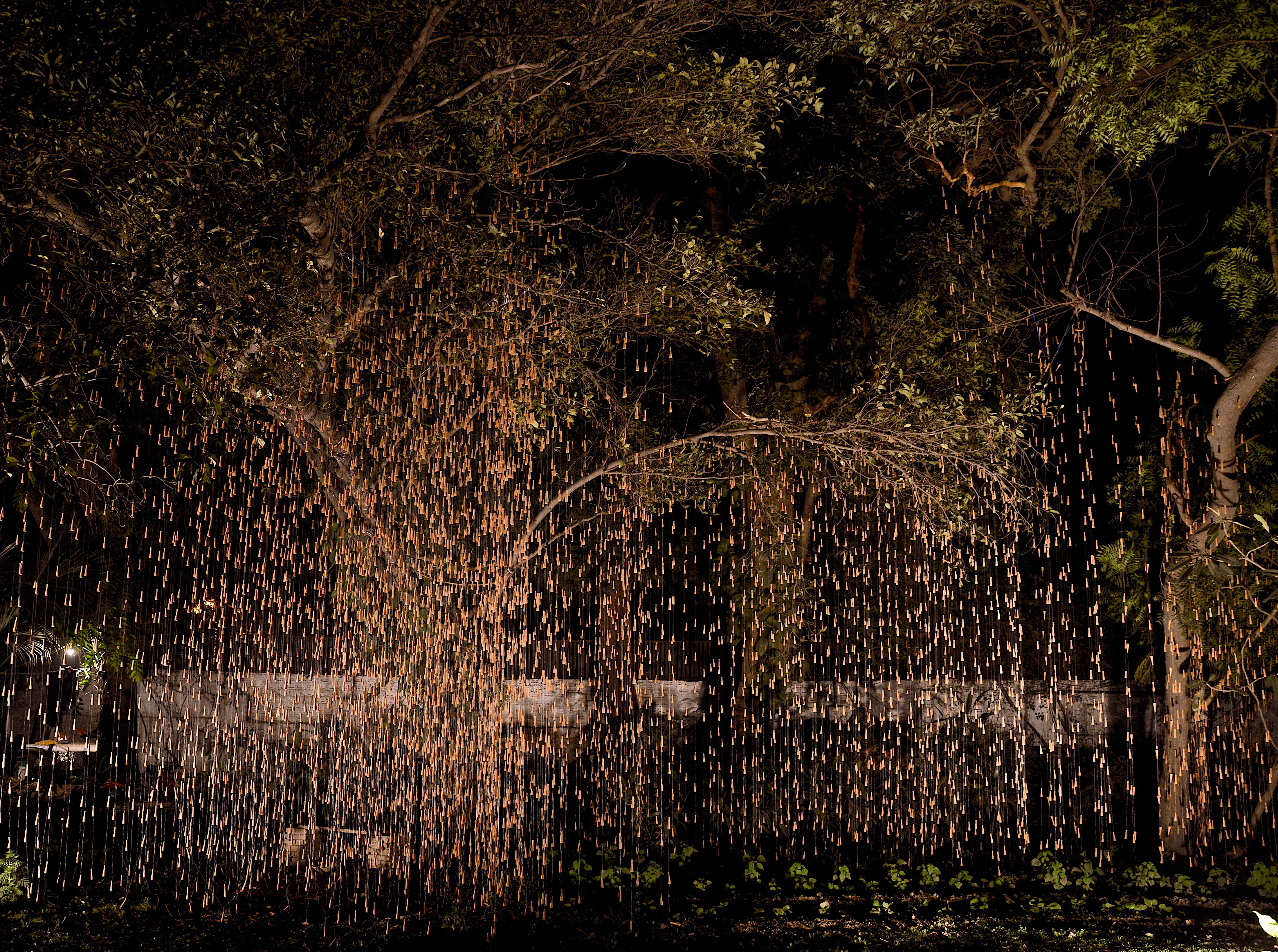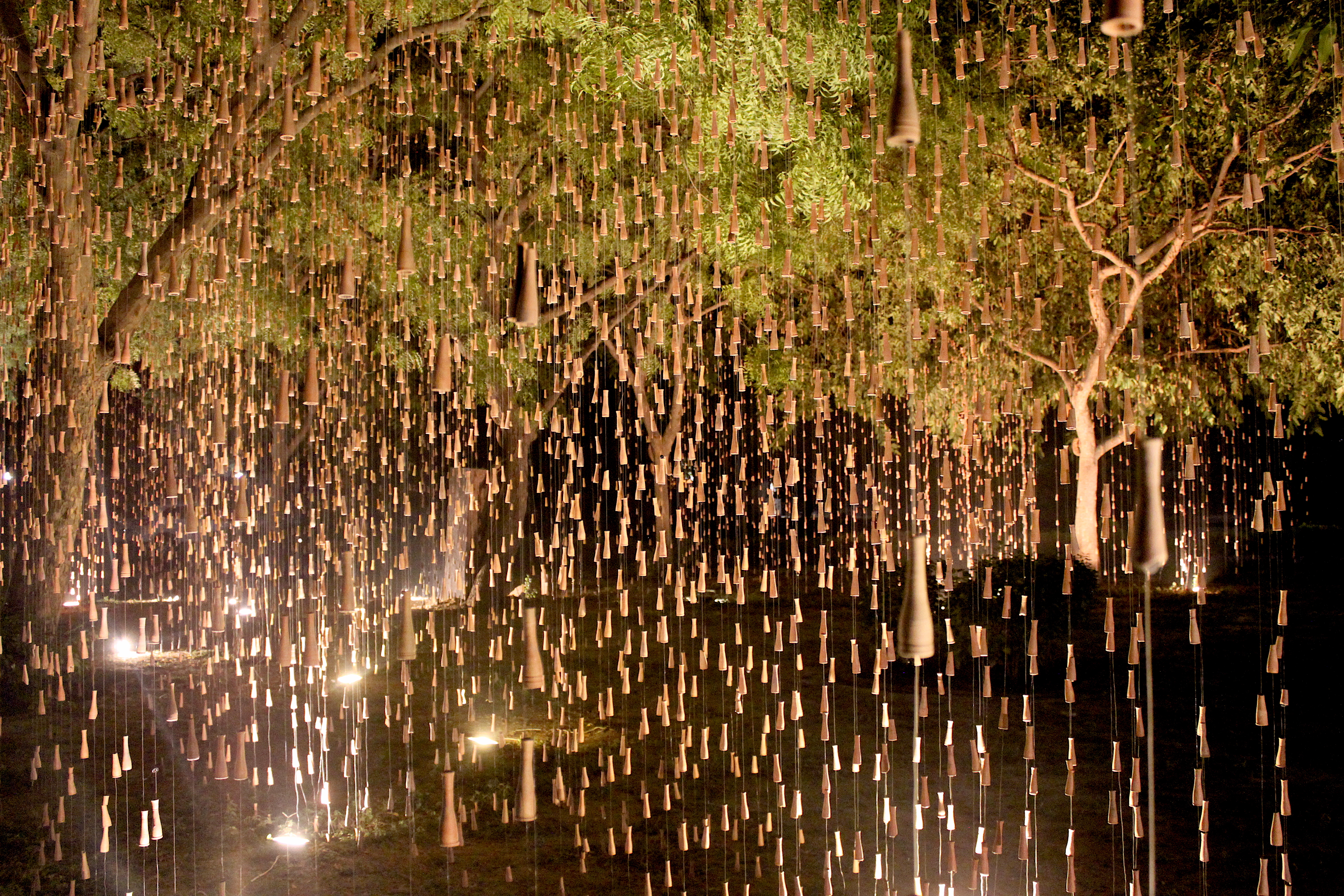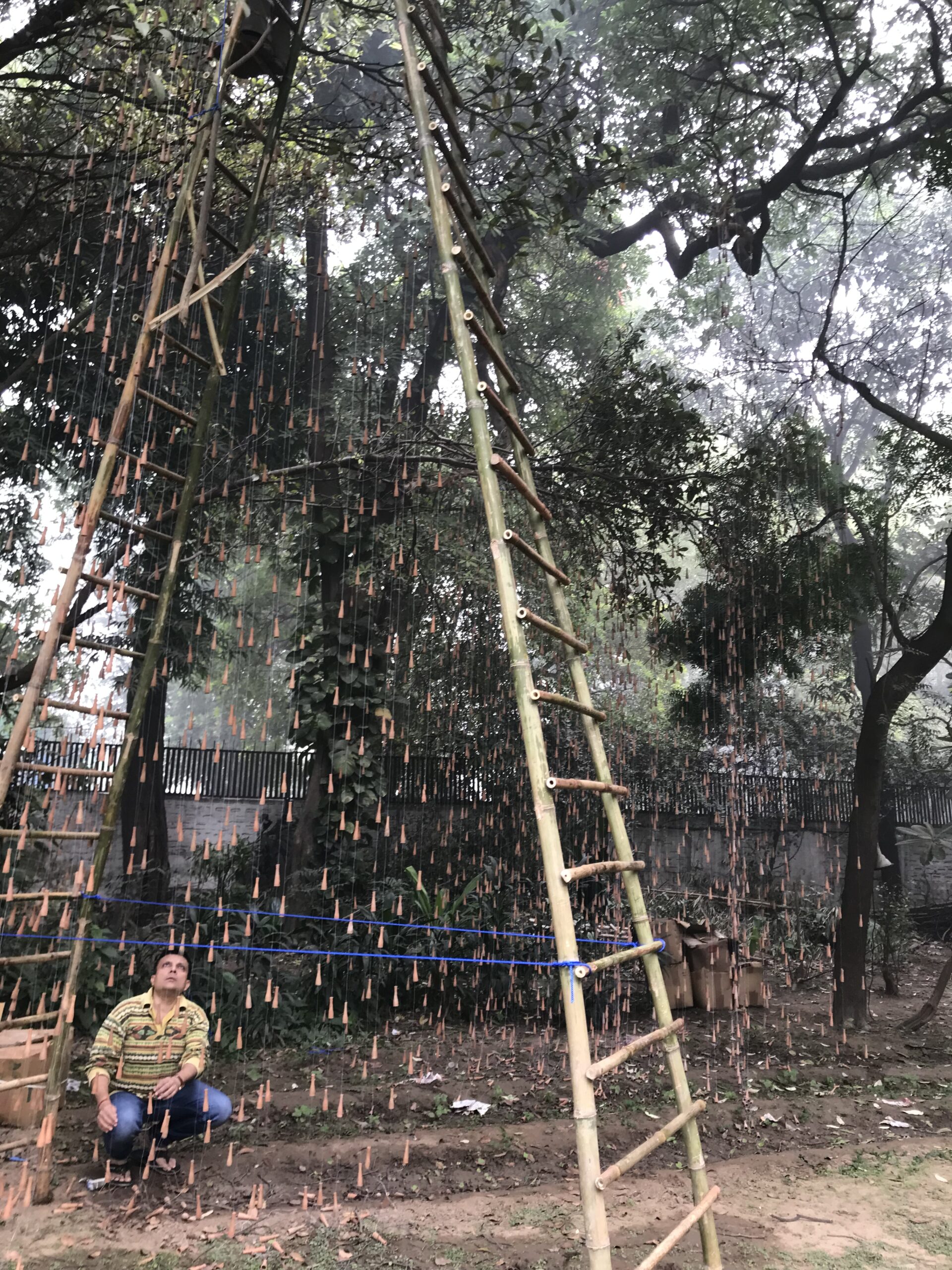 Quoting Art Critic Sumati Maheswari ‘The true essence of Gupta’s creation lies in the wonder and awe that it evokes, of art imitating nature. Right from the first glance that the viewer has – as a first panoramic perspective encounter, the moment he/she has rain in sight, right up to the point when one stands amidst the falling rain hanging from tree branches. This immersive encounter allows viewers to appreciate Gupta’s skilful portrayal of the simple yet profound phenomenon of rain. The effect created by Gupta’s installation is akin to the visual experience of an object placed between parallel mirrors, evoking a sense of fascination and immersion. Interestingly, this sensation surpasses the intoxication typically associated with the chillum itself. Gupta encourages his audience to metaphorically “get drenched in the rain,” enticing them to fully embrace the artistic encounter.