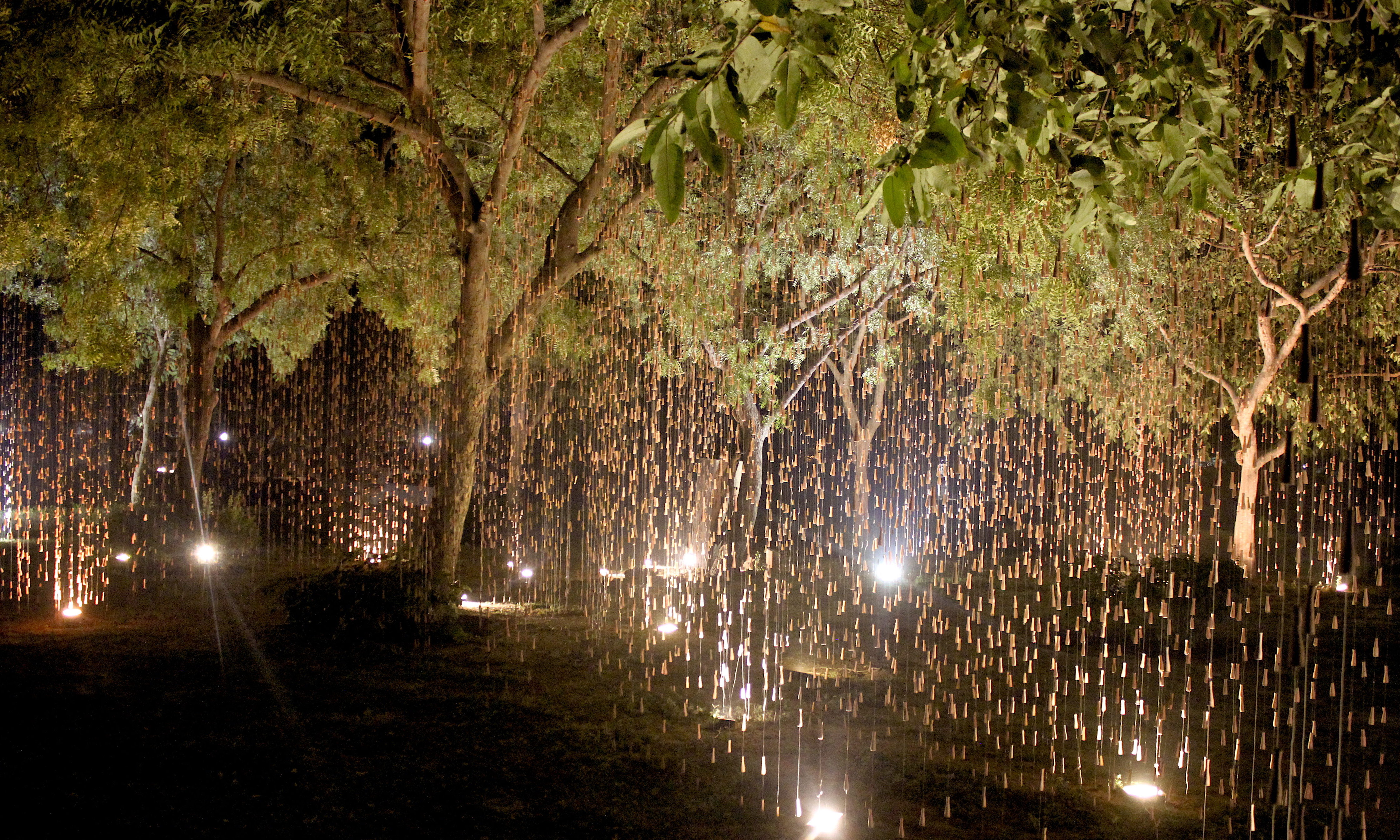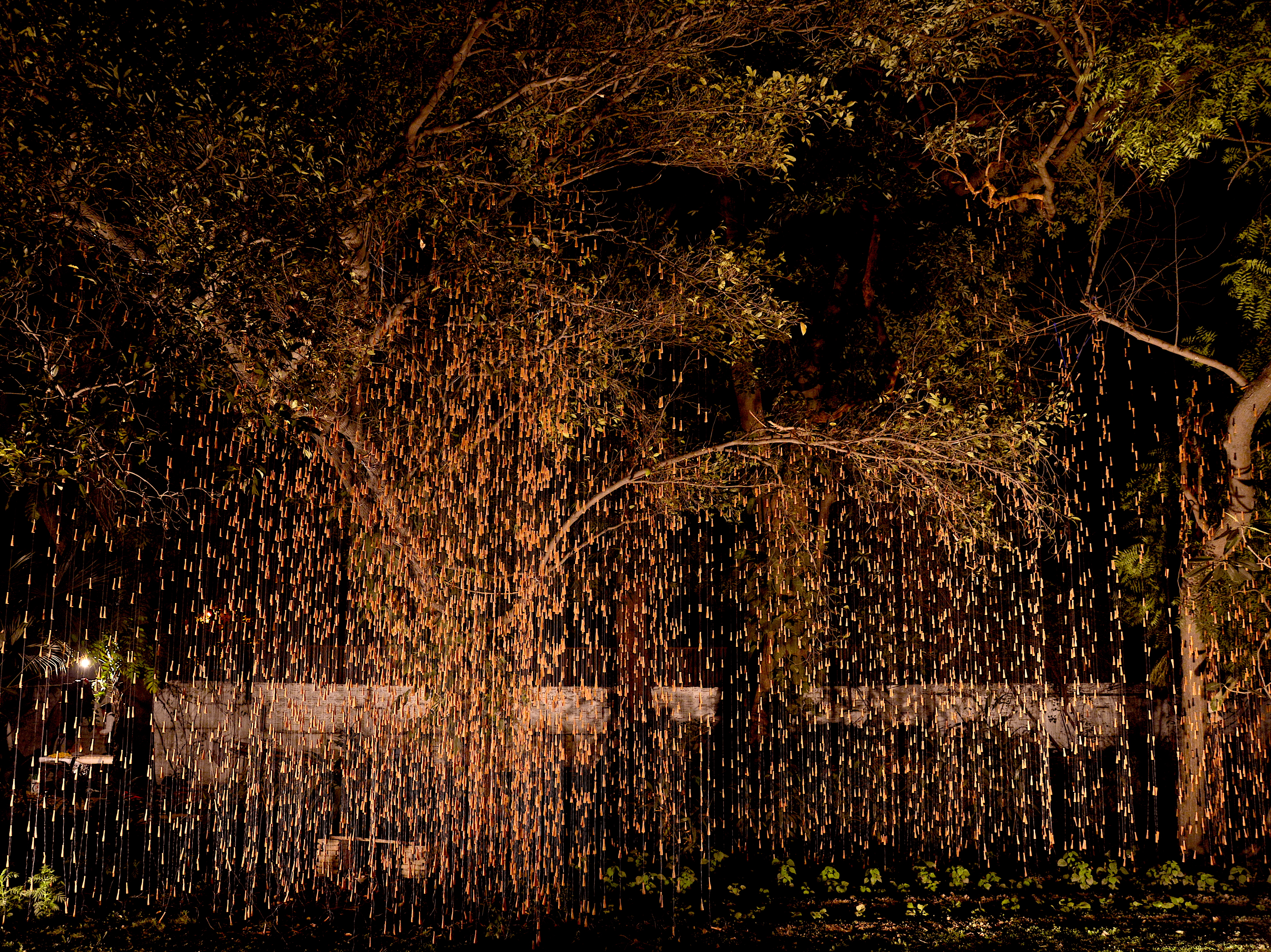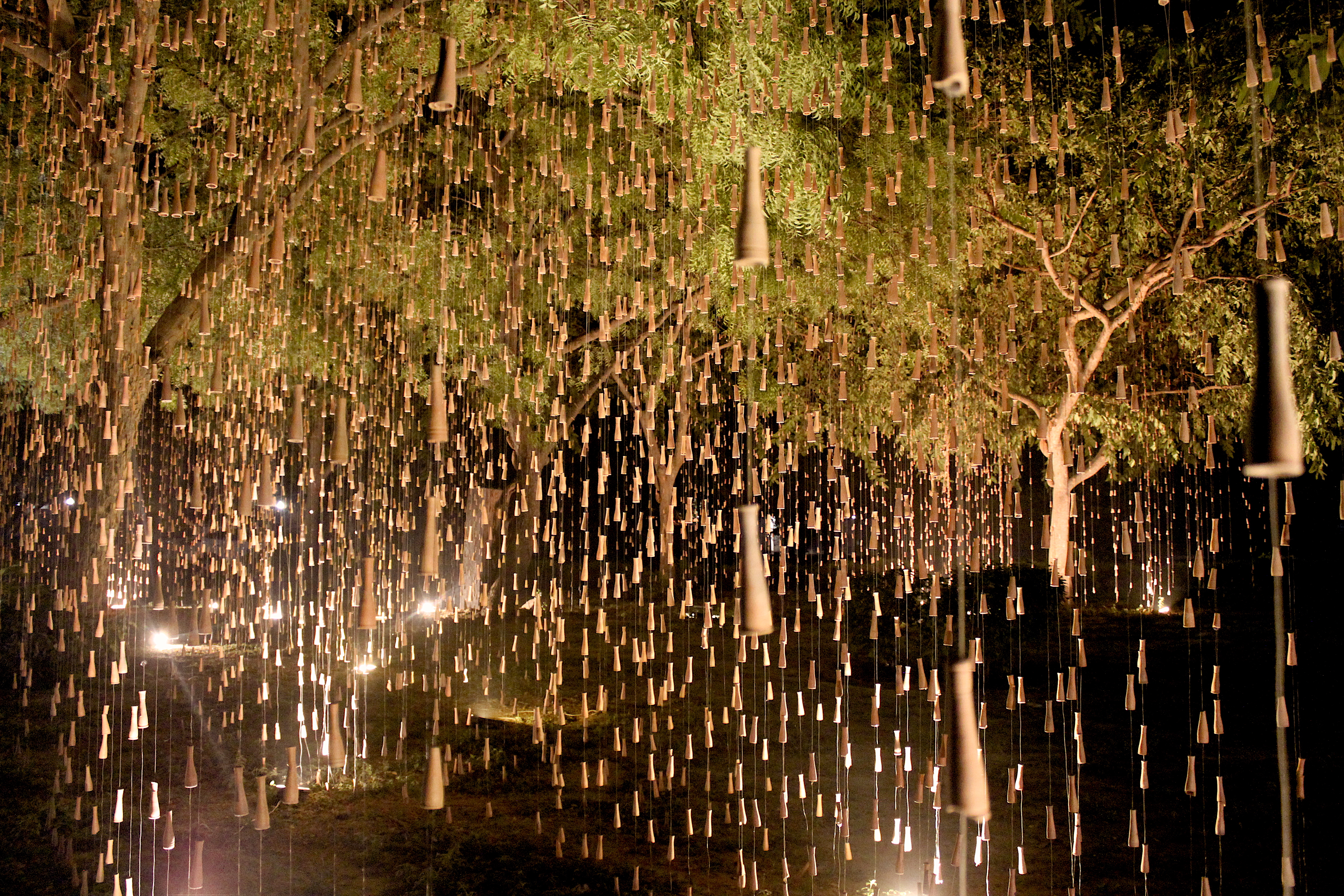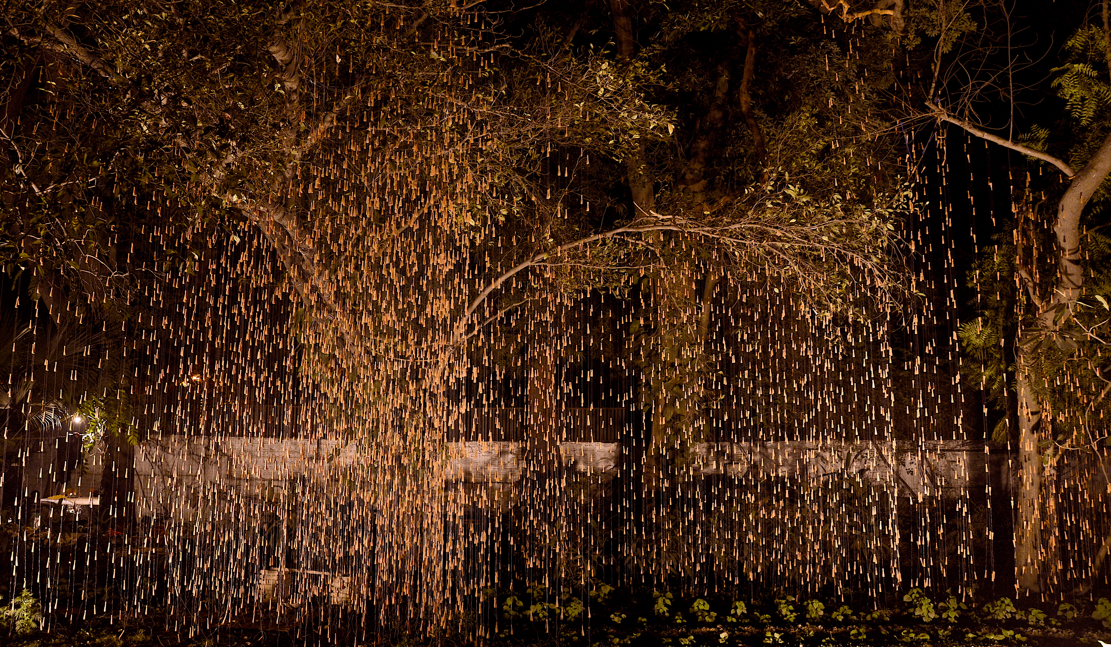 Quoting Art Critic Sumati Maheswari ‘The true essence of Gupta’s creation lies in the wonder and awe that it evokes, of art imitating nature. Right from the first glance that the viewer has – as a first panoramic perspective encounter, the moment he/she has rain in sight, right up to the point when one stands amidst the falling rain hanging from tree branches. This immersive encounter allows viewers to appreciate Gupta’s skilful portrayal of the simple yet profound phenomenon of rain. The effect created by Gupta’s installation is akin to the visual experience of an object placed between parallel mirrors, evoking a sense of fascination and immersion. Interestingly, this sensation surpasses the intoxication typically associated with the chillum itself. Gupta encourages his audience to metaphorically “get drenched in the rain,” enticing them to fully embrace the artistic encounter.